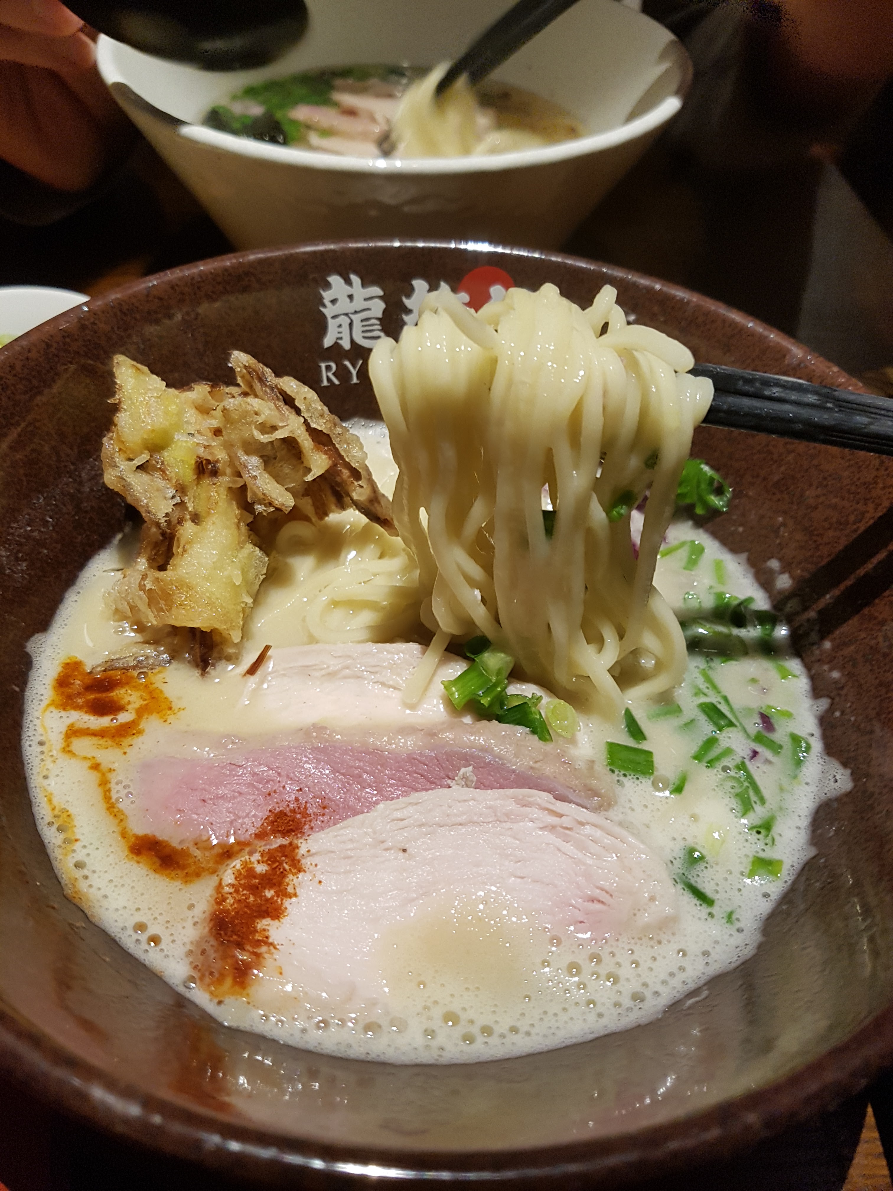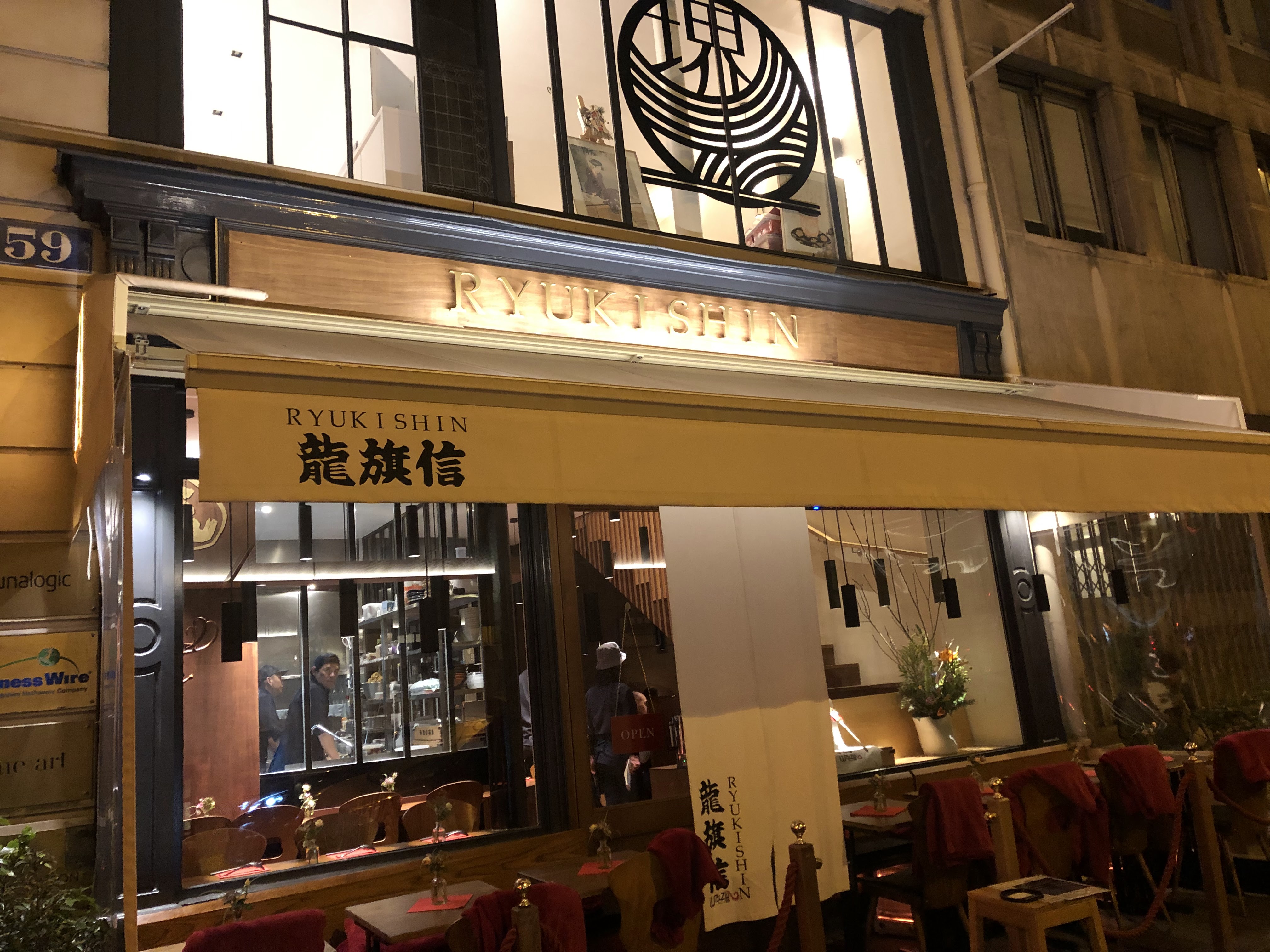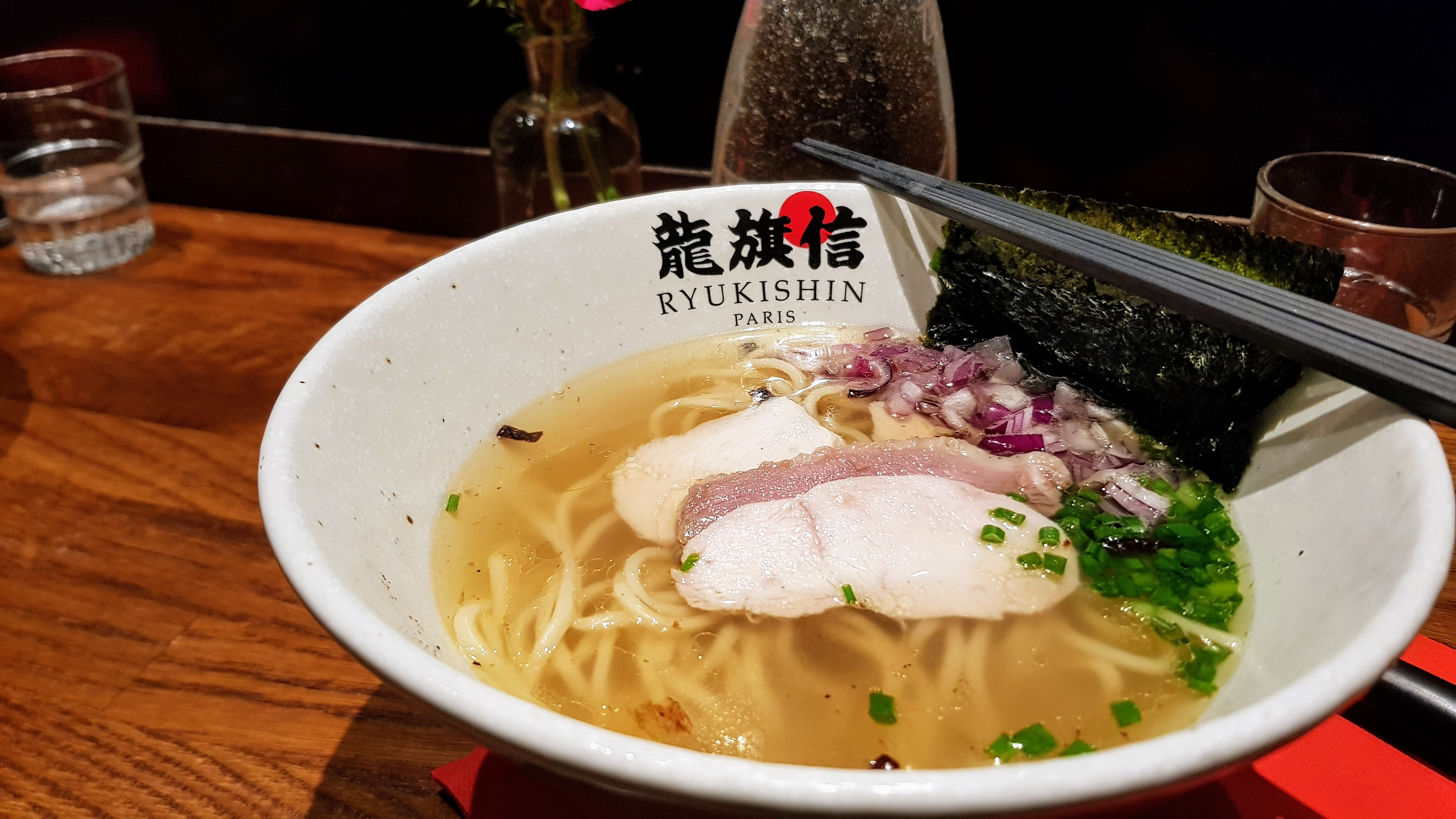 Pas de porc à la carte : les plats sont à base de poulet, canard, végétariens ou vegan. Loin d’un positionnement street-food, Ryukishin joue la carte du raffinement et de l’équilibre de saveurs. À ~20€ le bol de ramen ou tsukemen, pensez à prendre la portion supplémentaire de nouilles (+2€) si vous êtes habitués aux concurrents moins haut-de-gamme du quartier. L’ambiance est particulièrement tamisée & le service adorable.