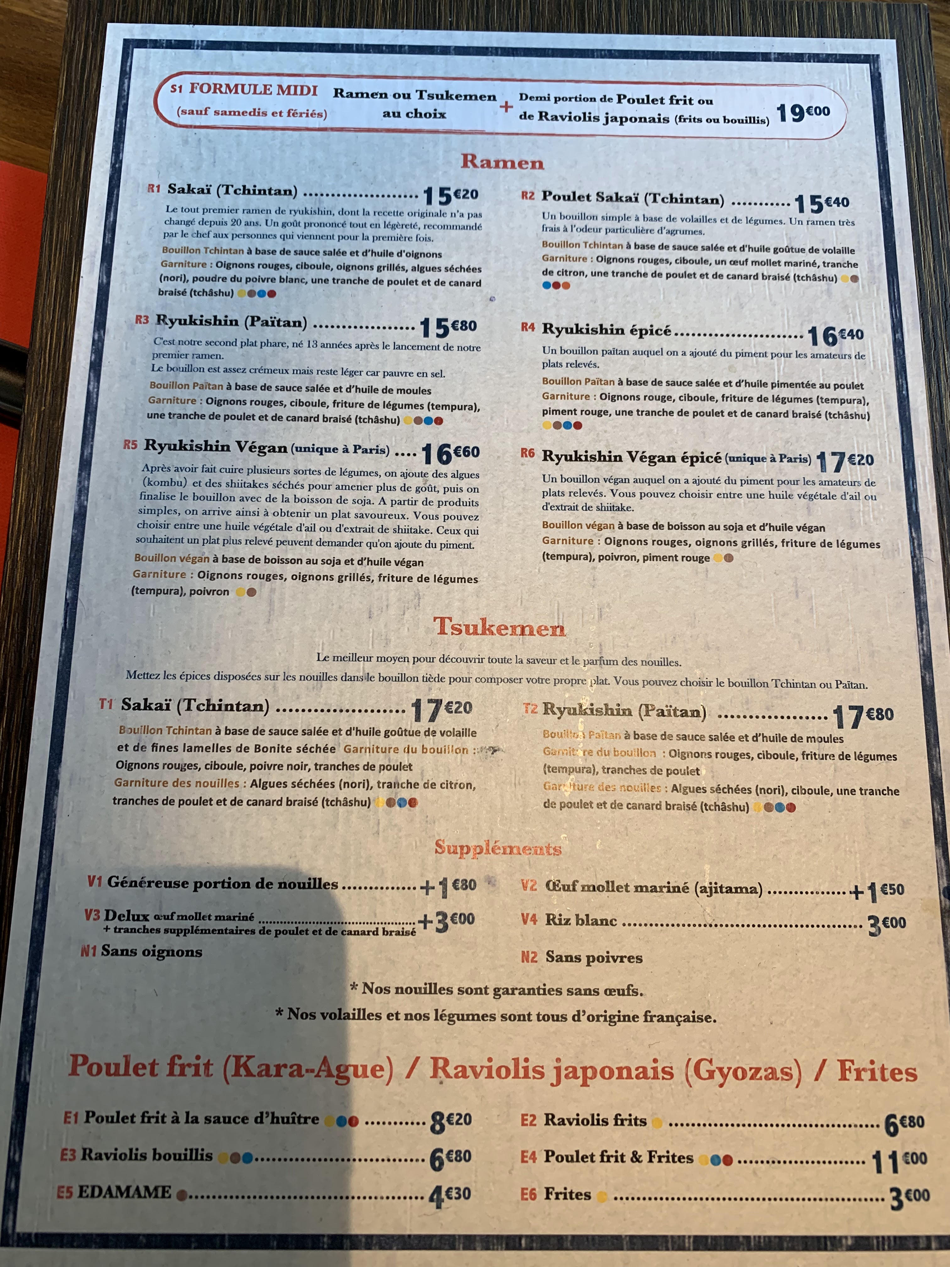 Cadre sympa. Possibilité de réserver ce qui est assez rare dans le monde des restaurants de ramens où il faut généralement attendre une heure pour se remplir la panse. Le ramen Sakai est un peu pauvre et pas tellement goutu. Le Ryukishin épicé est meilleur, le tempura est excellent. Les ramens ne sont a mon sens pas très garni et il faut rajouter des suppléments par exemple sur le ramen de base. Supplément qui n'existe pas forcément comme les algues ou les menma généralement présents dans les autres restaurants. Pas de ramens avec de Chasu (porc) ici vous trouverez des tranches de poulet et de canard ainsi qu'un ramen vegan.