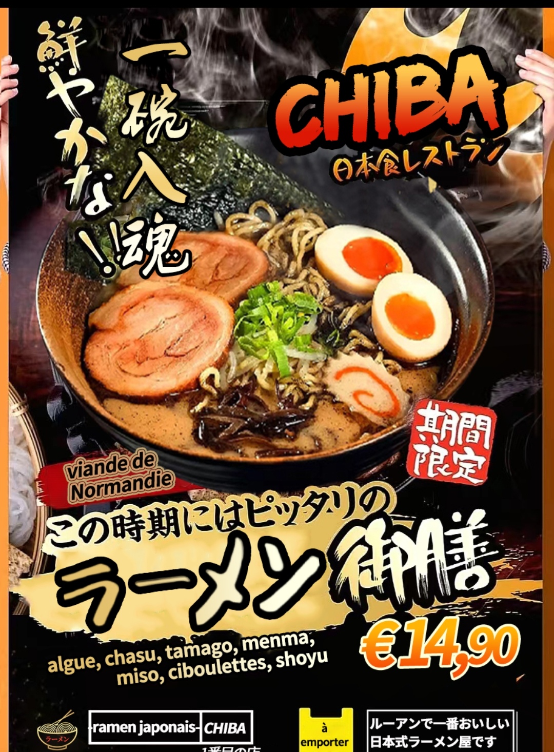 Si vous recherchez une véritable expérience culinaire japonaise, ne cherchez pas plus loin que CHIBA RAMEN. Leur Ramen Jikasei boeuf est tout simplement incroyable, avec des saveurs audacieuses et un bouillon parfaitement équilibré.