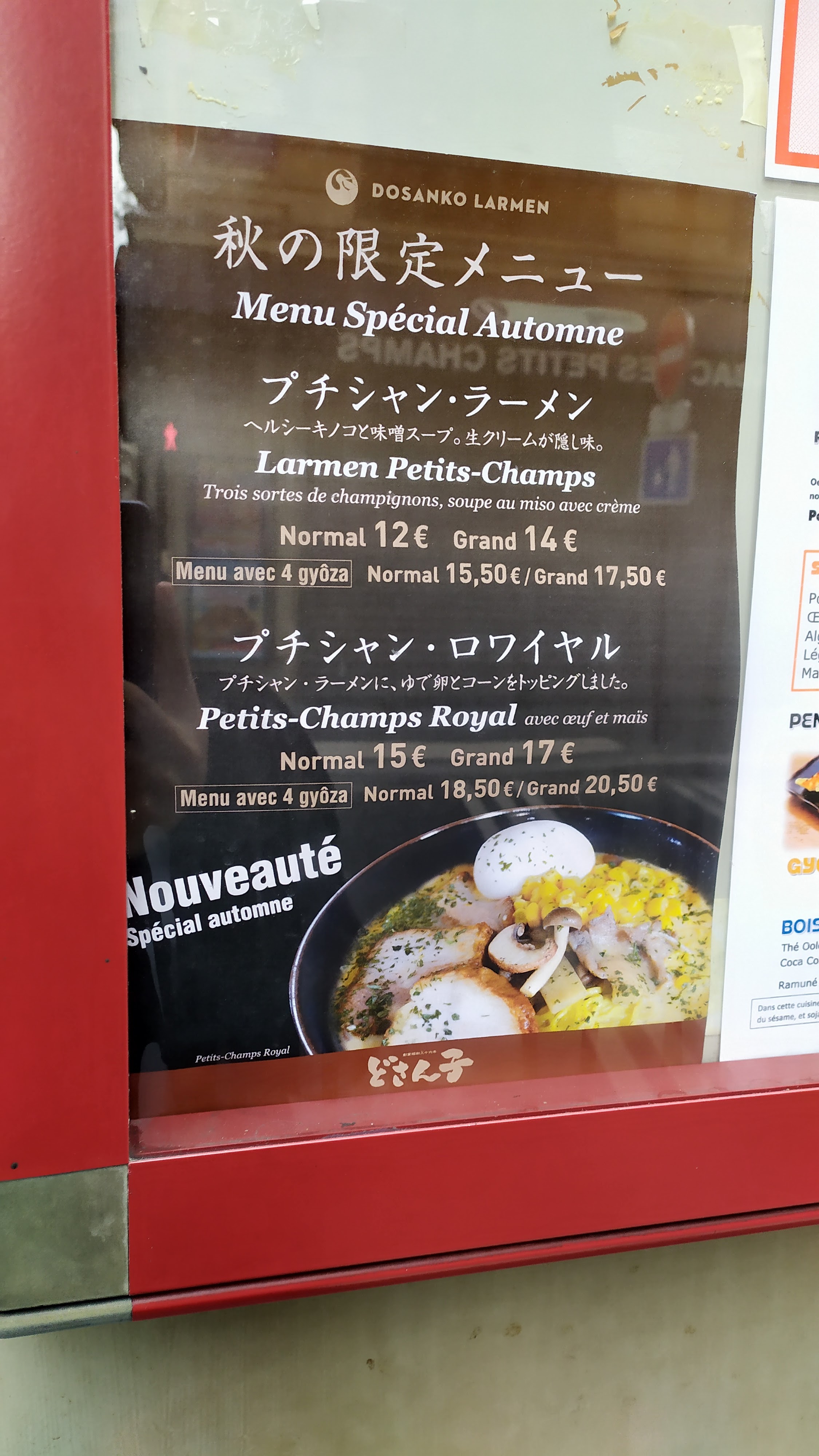 Menu rouge avec rajout de maïs et de deux œufs marinés : 17,50€ 2 sakés Shochikubai : 7,50€ l'unité Menu blanc avec rajout de poireaux pimentés avec une autre fournée de Gyoza : 22,00€ Mio (boisson 30cL) : 14,00€ Menu Poireaux Royal comprenant quatre Gyoza et un Ramen au poireau : 18,50€ Ume Shu (verre) : 5,00€ Très bon et très copieux ! La quantité était même trop importante à mon goût. ^^ La boisson m'a étonné, elle n'était pas trop forte et vraiment fruité. Léger, comme j'aime.