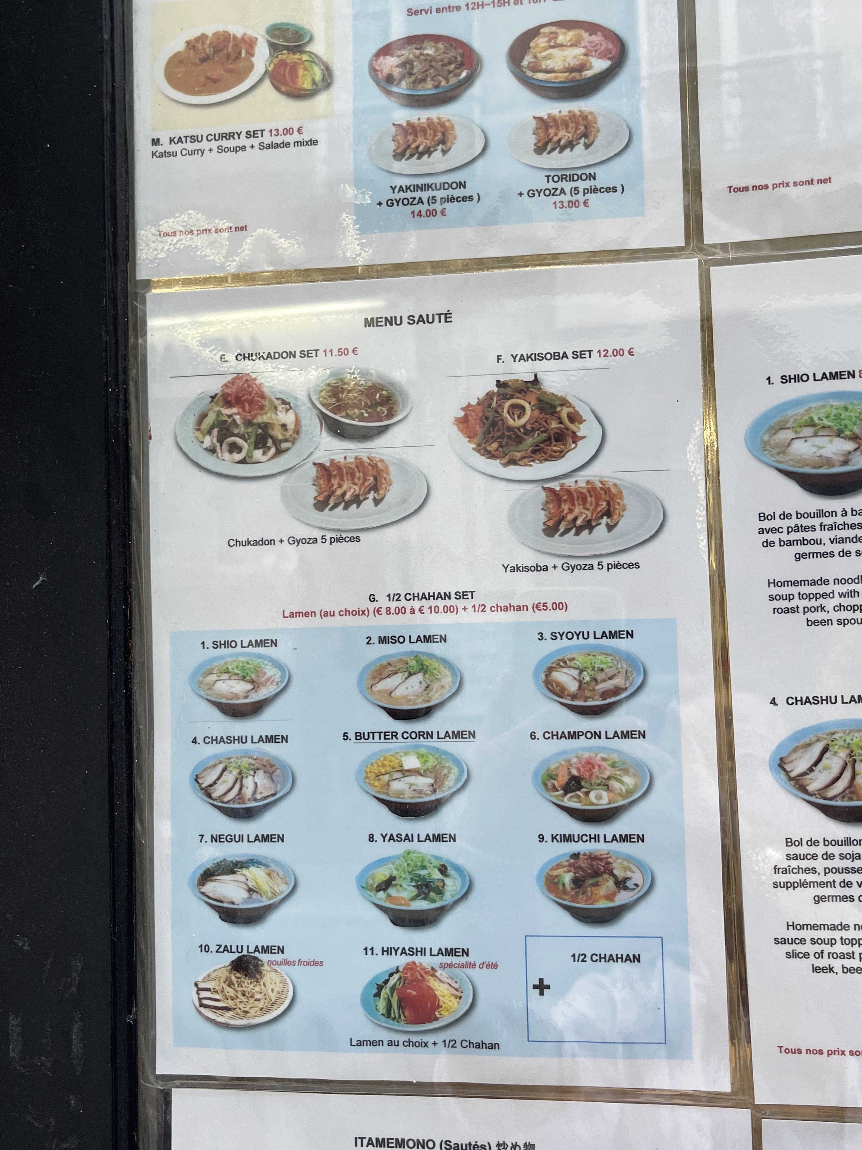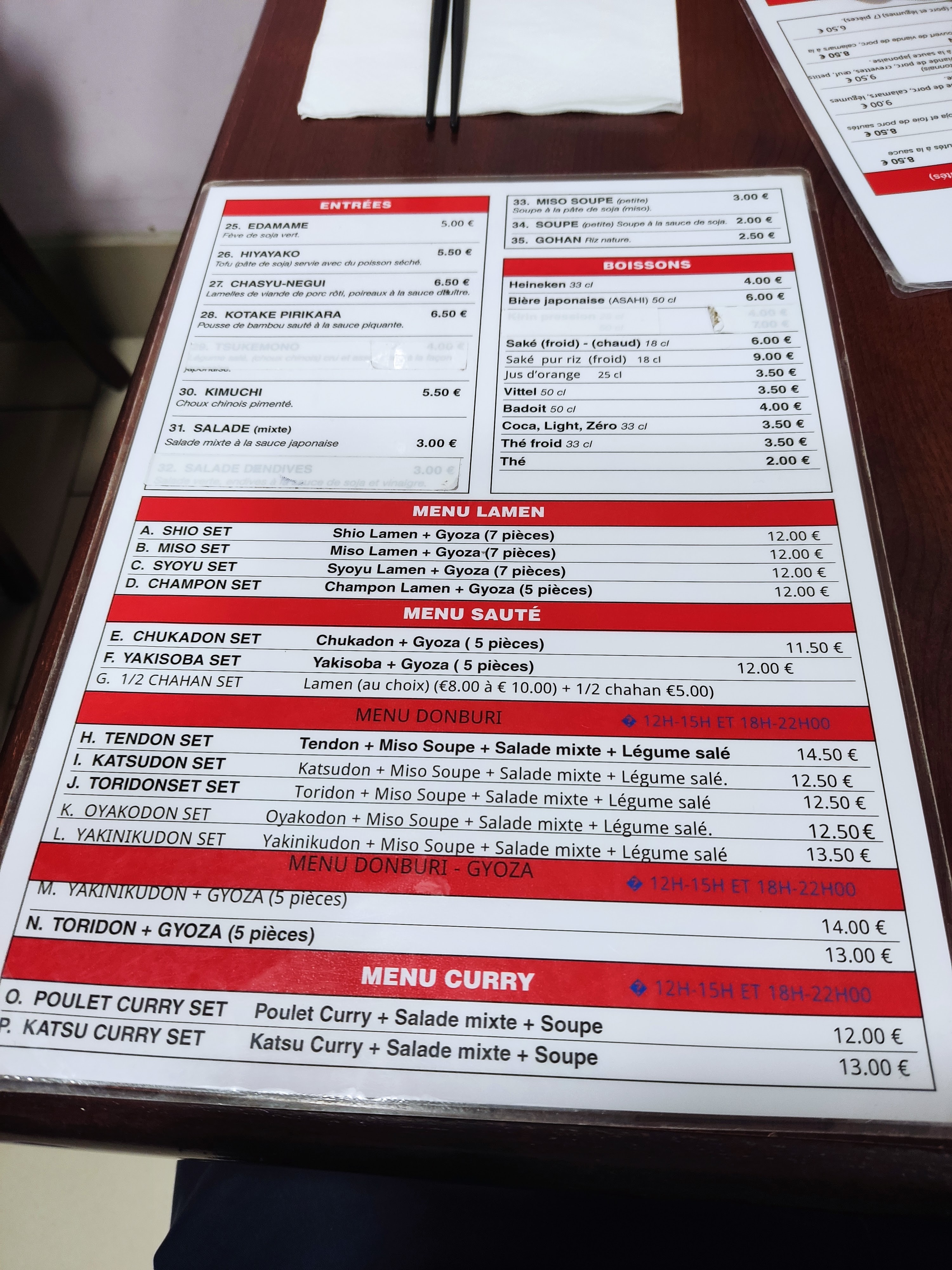 Le menu ramen miso 13€ (7gyozas) : le bouillon est plutôt salé. Le Tendon 12€50 : la sauce dans le riz gâchait un peu tout et en plus à cause de ça les tempura étaient mous Chasyu+Negui 7€: même viande que les ramen donc bon mais pas trop d’intérêt mais c’était bon Globalement pour manger des ramen c’est pas très cher et plutôt correct Des toilettes pas propres du tout…