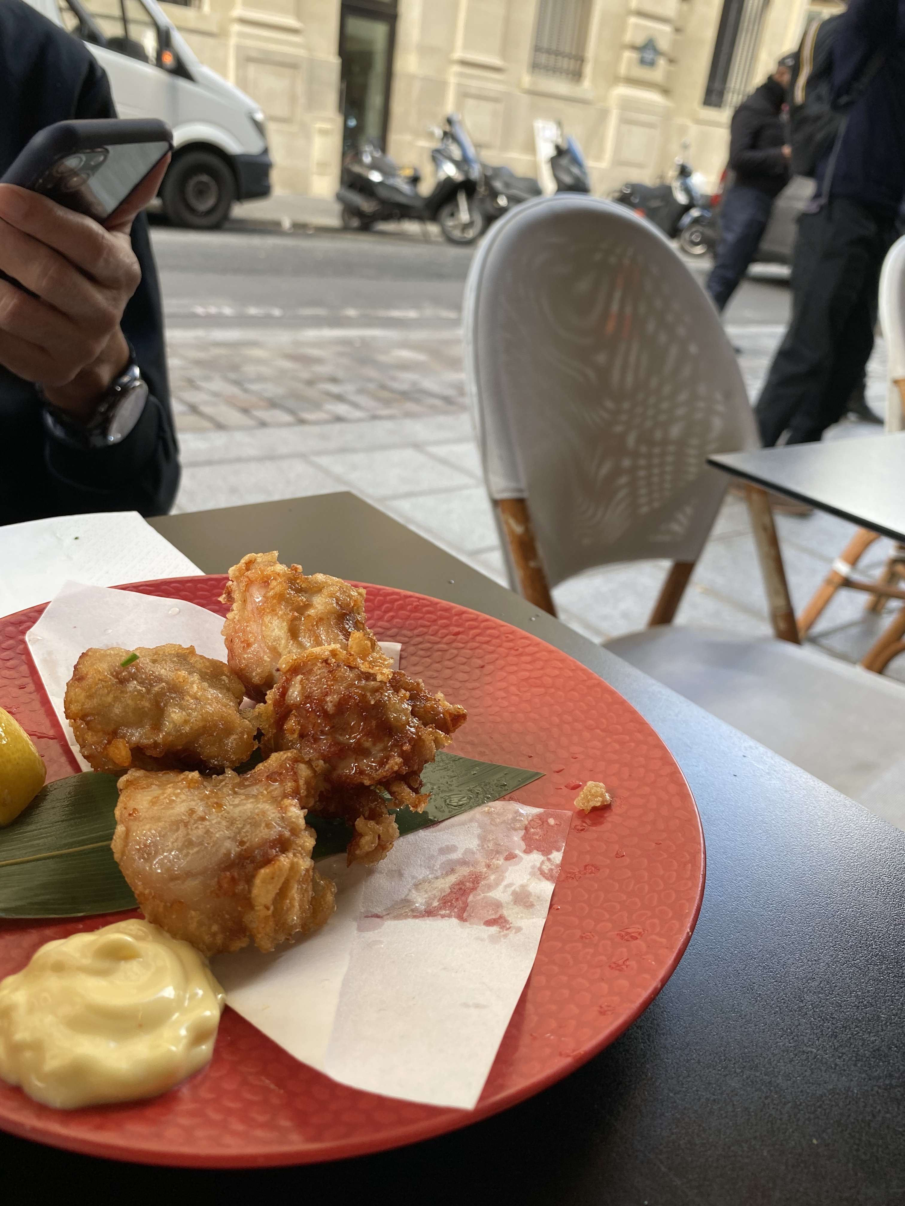 Selon moi Ippudo est en même niveau que Ryukishin sauf il est plus spacieux chez Ippudo. Avec ma femme nous avons commandé un Shinomaru(bouillon salé) et un Akamaru(bouillon un peu piquant) en mode spécial, c.a.d plus un œuf, deux tranches de porc chashu et deux feuilles de d’algues nori en plus. En plus nous avons également essayé leur Kara-Age. En détail c’est le poulet frit, mariné dans le dashi maison auparavant, servi avec une mayonnaise au curry. La friture et le goût sont au top!!! Je vous le recommande fortement!!!