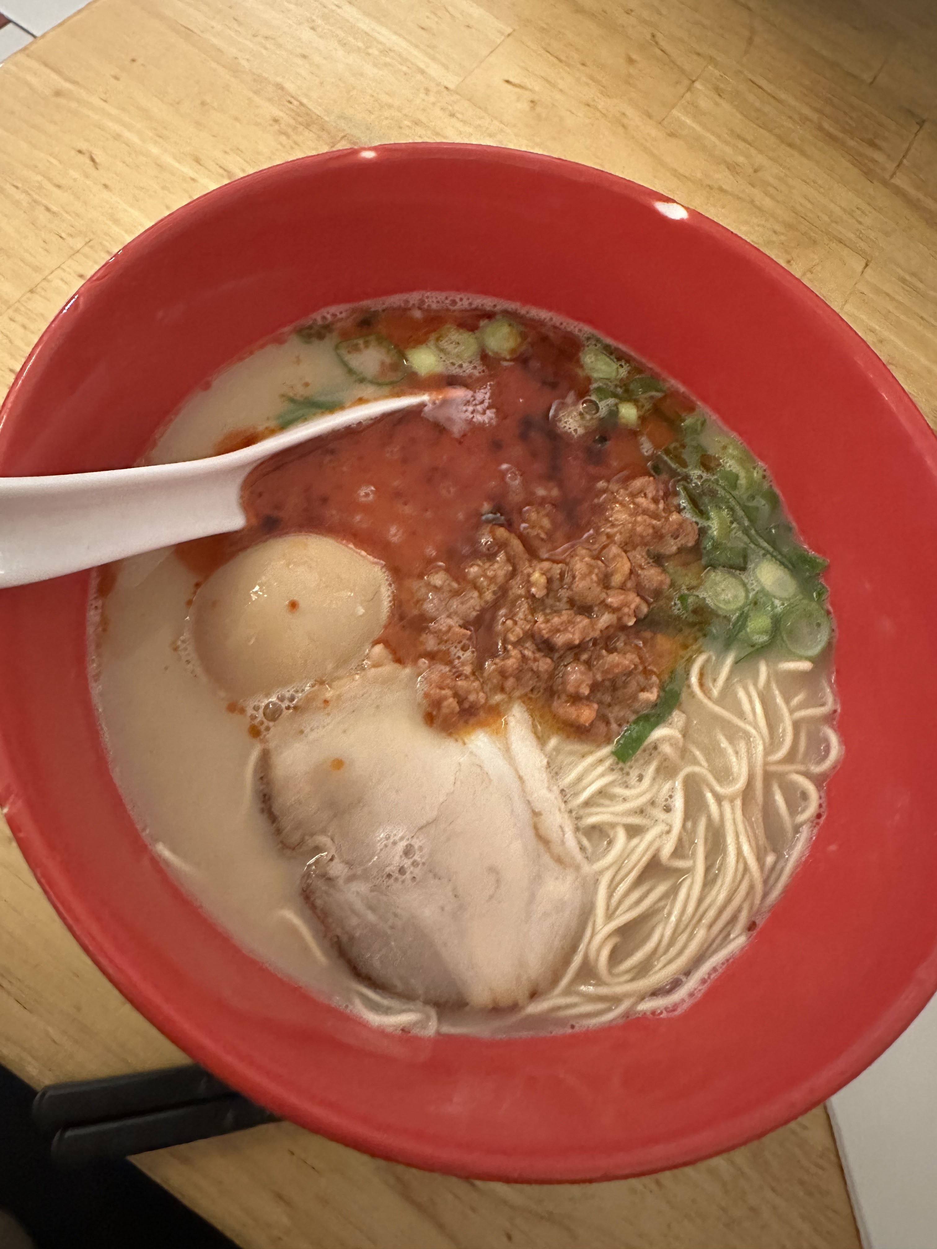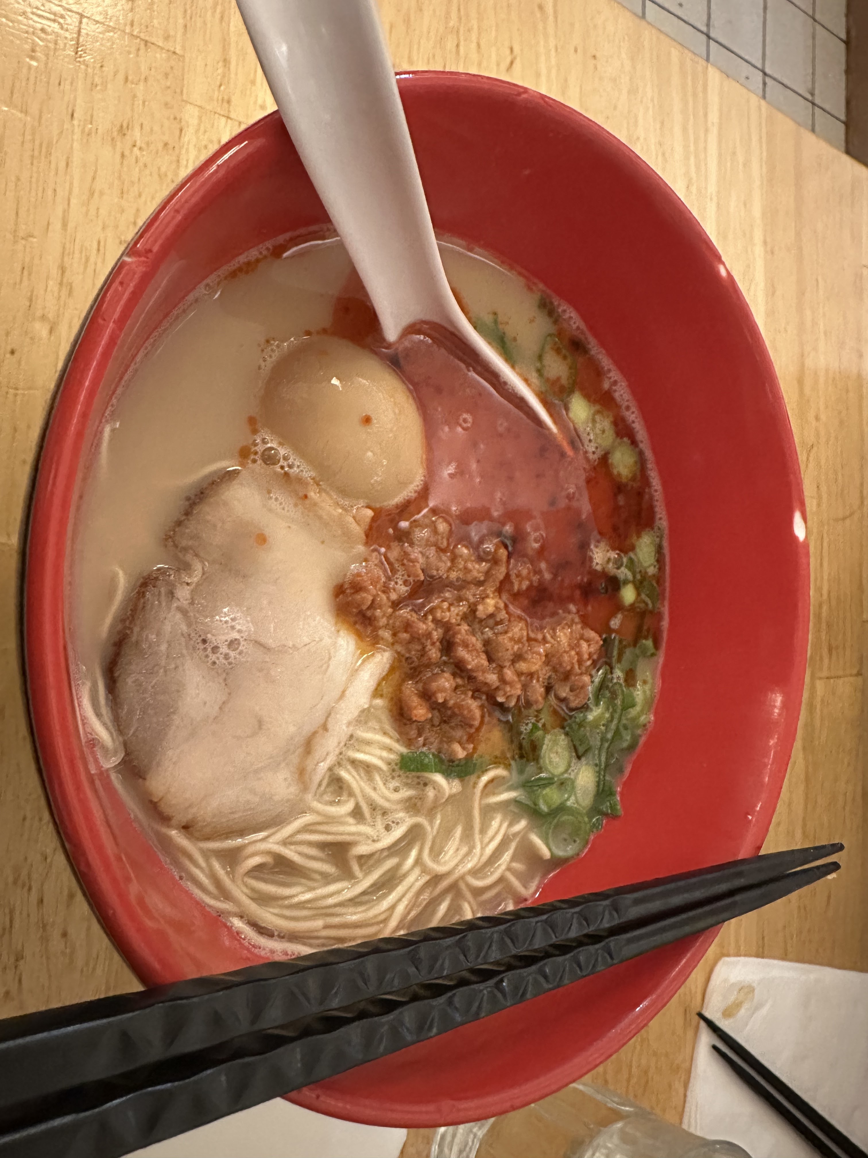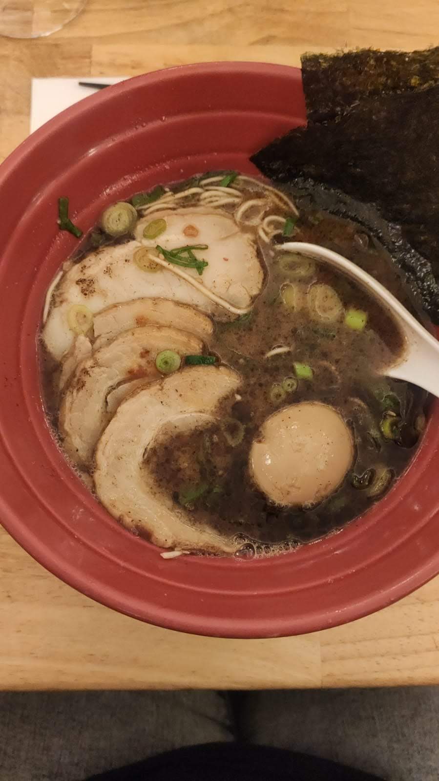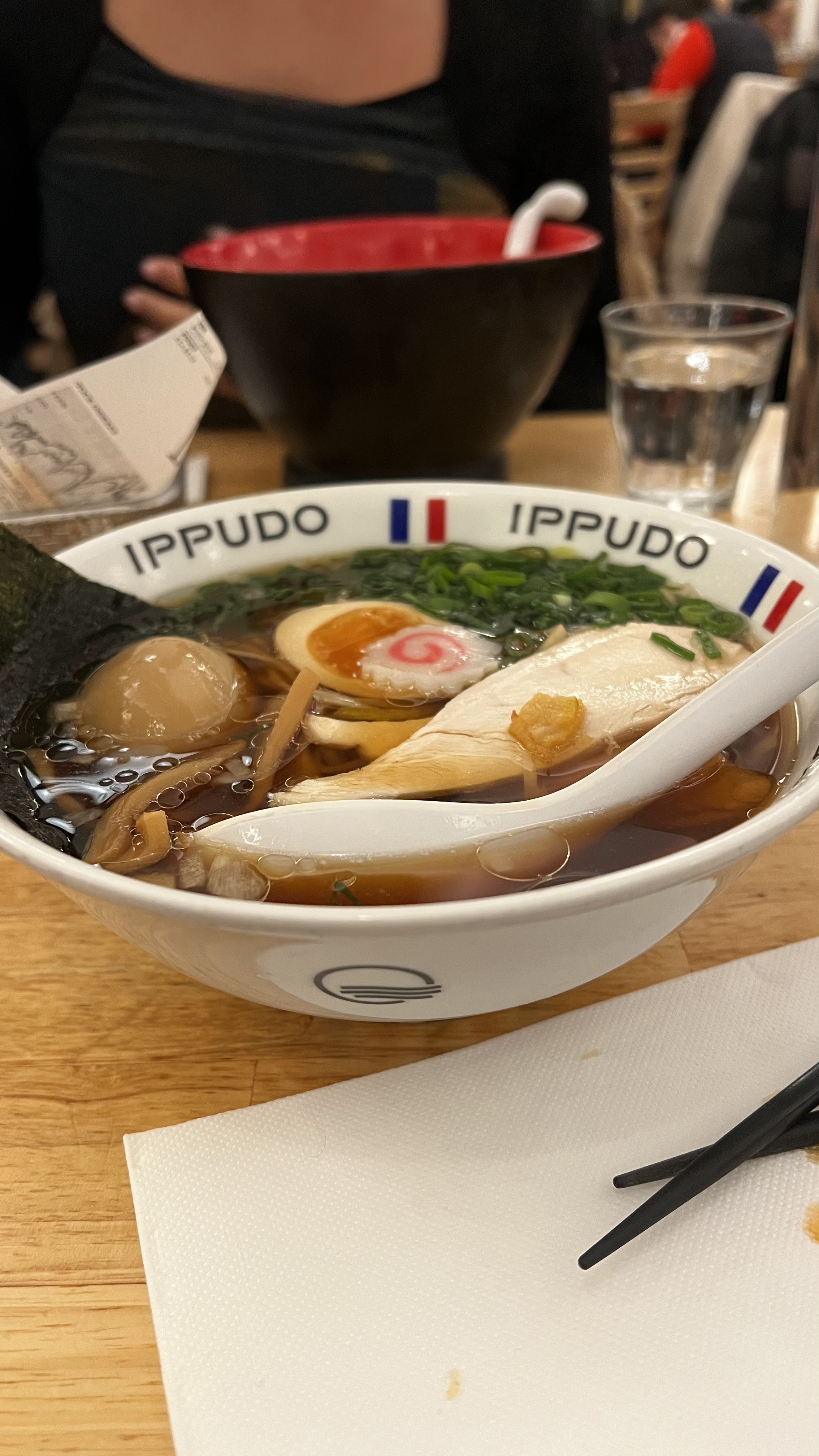 L’accueil est top, on est arrivés peu avant la fermeture de la cuisine en semaine donc pas du tout d’attente, il y a pas mal d’espace comparé a d’autres restaurants de ramen. Disons le tout de suite : c’est très cher pour ce que c’est. Pour 19€, j’ai eu le bouillon classique avec supplement algue, oeuf et 2 tranches de chashu. La portion est assez légère, les nouilles sont fines et l’œuf était raté car trop cuit. Par contre le gout y était, le bouillon était bien salé mais pas trop gras, la marinade de l’oeuf se sentait bien.