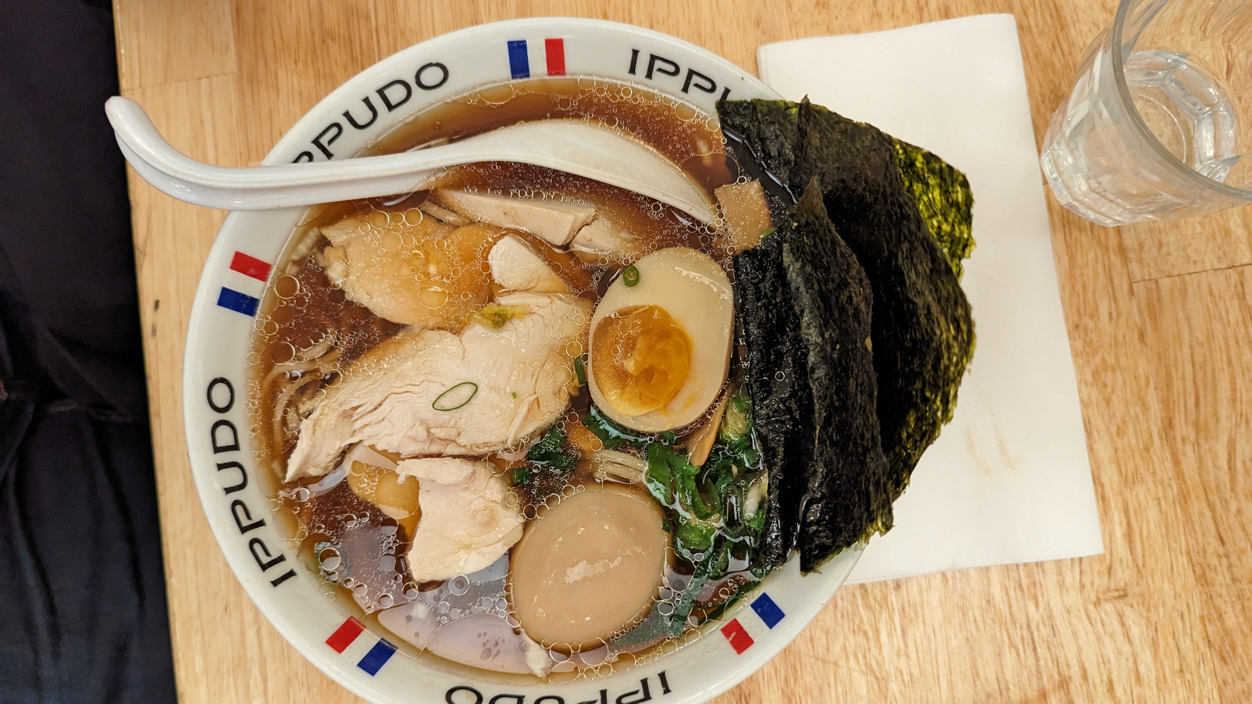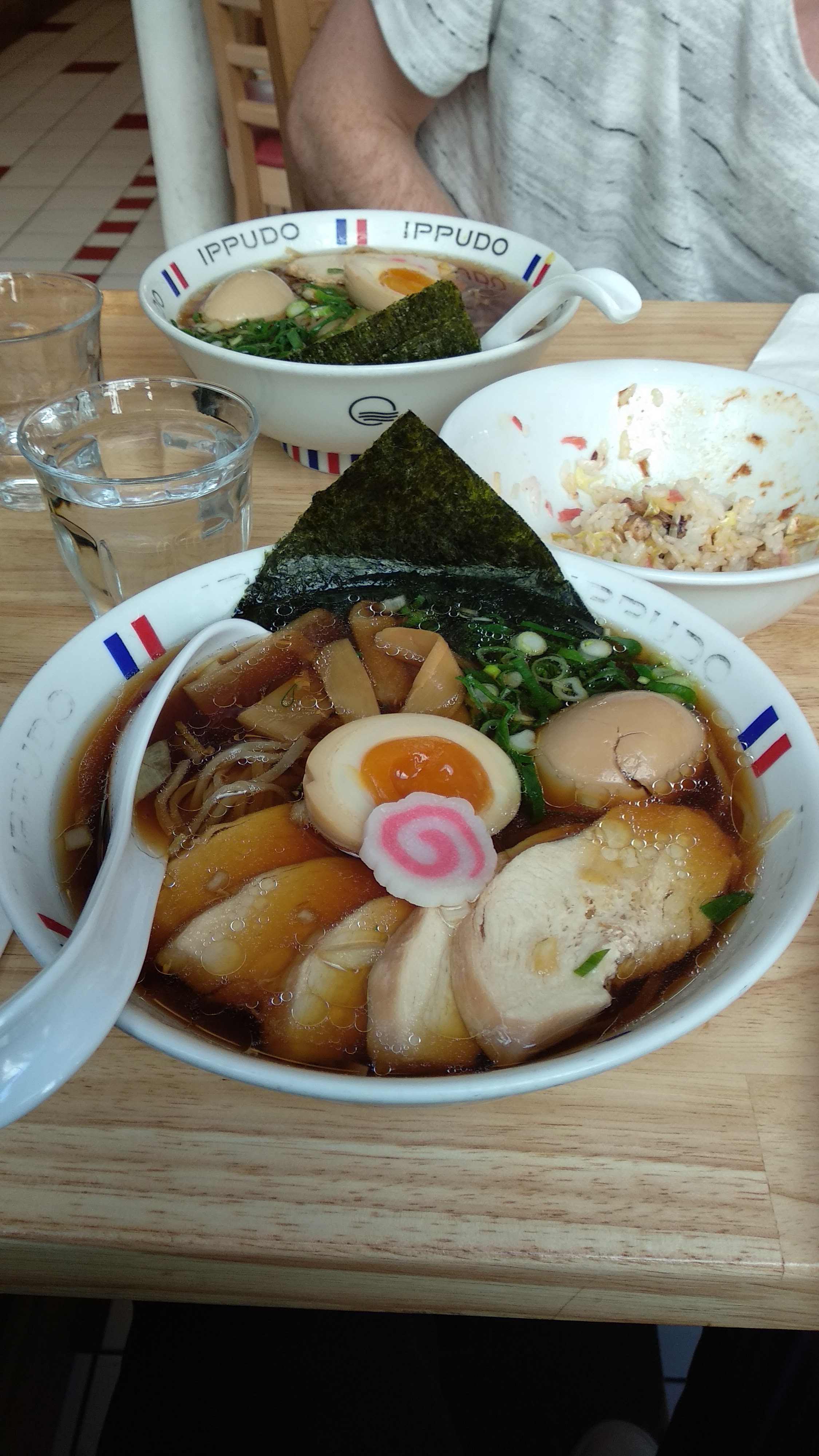 Ippudo est toujours une bonne adresse pour un bon ramen. Le bouillon est savoureux, assez gras mais pas trop, on pourrait le boire entièrement. Le chashu n'est pas le meilleur, il peut être un peu plus sec qu'ailleurs et avec un goût de porc assez prononcé. Dans l'ensemble c'est une bonne chaîne de ramen.
