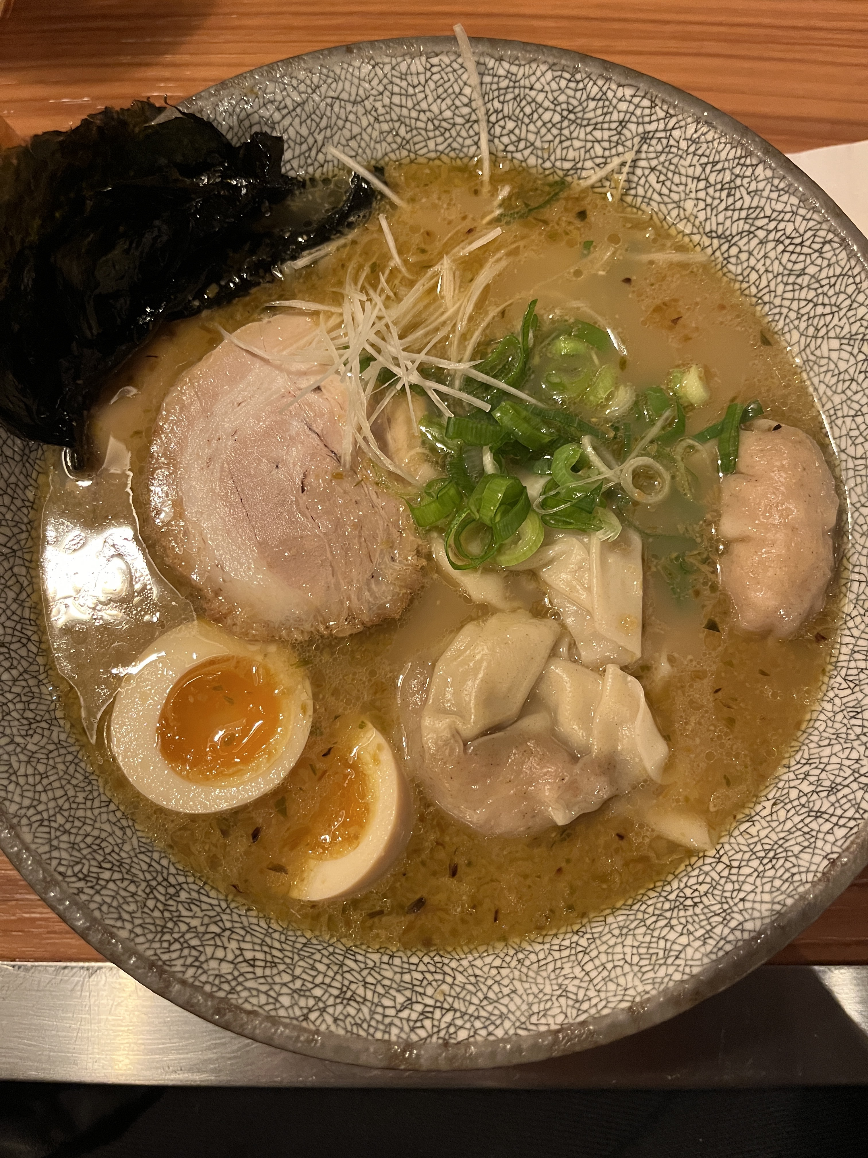 Ambiance agréable spéciale qui vous coupe de Paris, personnel très souriant et à l'écoute, service rapide. Il existe deux sales, celle d'en bas; plus travaillée est ma préférée, les tables sont trop proches par contre, aucune intimité. On a pris les ramen classic au tofu/algue noire et au poulet (halal), les bouillons sont trop bons. Dessert : cheesecake au yuzu 😍 , glaces au thé vert 👎🏻 + sésame noire 👍🏻. Je reviendrai pour tester les entrées aussi. Bref, en rentrant je cherchais de bons plans pr réserver mon prochain voyage au Japon 🌸