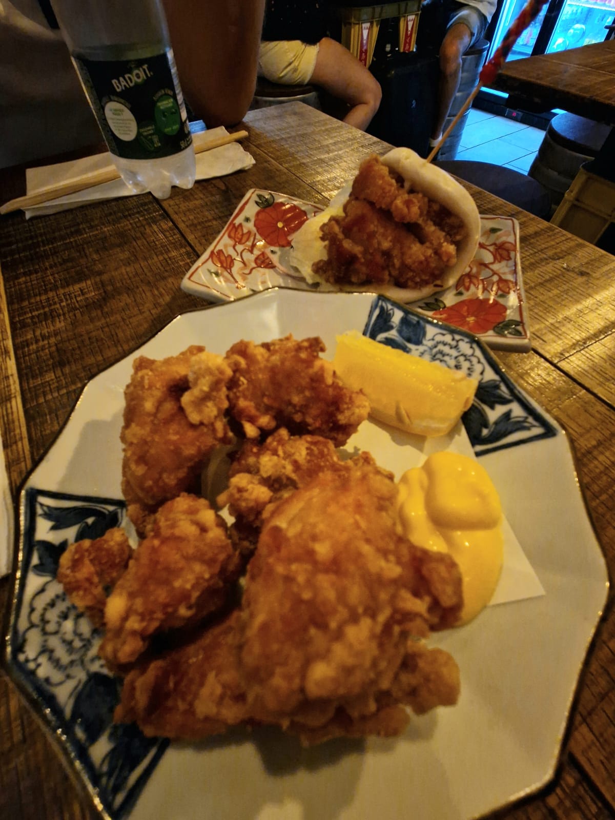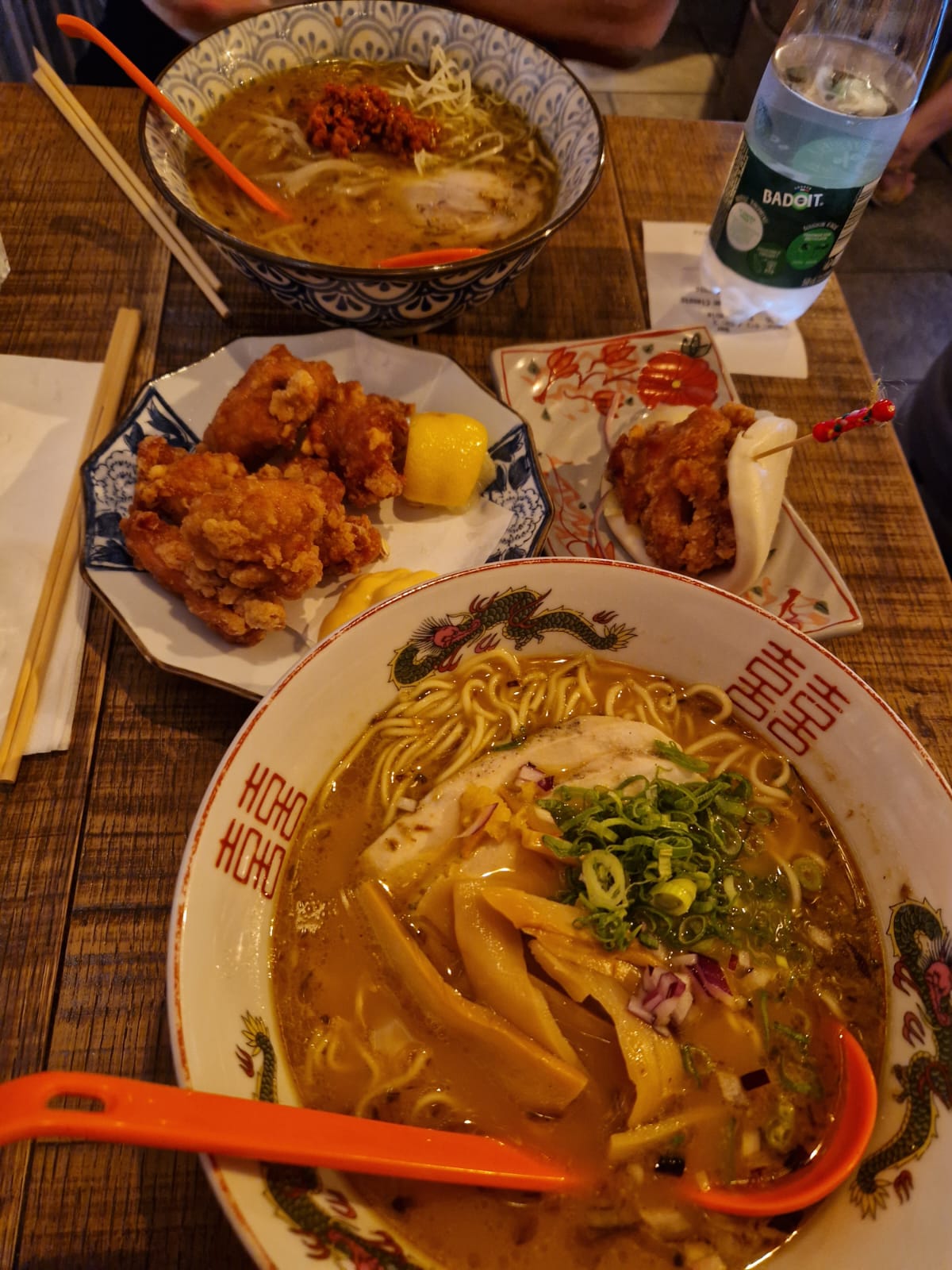 Un bon décor. Le personnel est sympa. Le service et rapide Le poulet frit est tendre et croustillant. Un peu de jus de citron lui apporte un goût rafraîchissant. Le ramen est correct, le tout est plutôt salé.