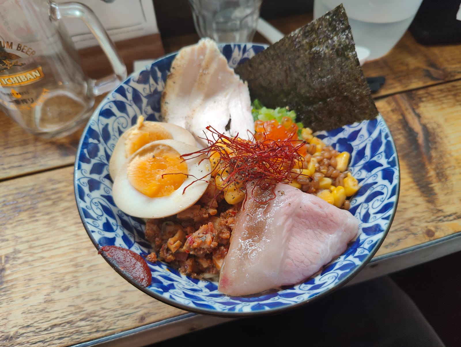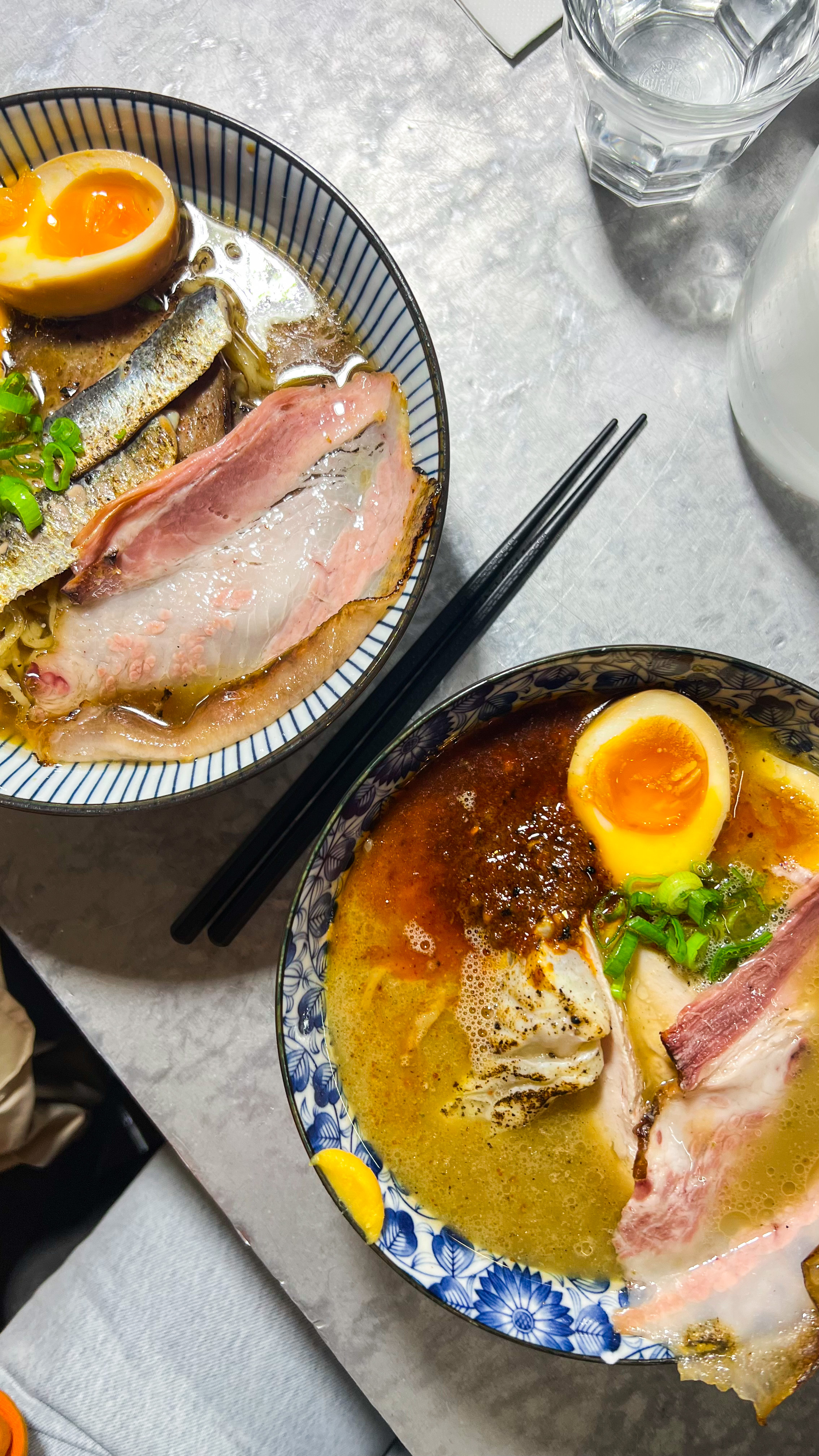 Si vous êtes ici, c'est très probablement que vous avez croisé ce restaurant sur Instagram ou TikTok... Pas de réservation possible, vous devez faire la queue, cette dernière est virtuelle et fonctionne avec l'app Skeepit qui vous laisse entrer dans la queue si vous êtes à moins de 3km. Une fois vos 30 mn d'attente écoulées, vous découvrez un décor assez dingue qui vous mettra tout de suite dans l'ambiance d'un comptoir de Ramen dans un marché de poissons juste à côté d'une gare (on entend le train passer) au Japon. Le restaurant n'est pas très grand mais très densément rempli, attendez vous à ne pas avoir beaucoup de place pour déguster votre plat et à être assis côte à côte face à des inconnus. Niveau cuisine, il n'y a rien à dire, c'est très bon. Les ramen sont accompagnés d'un poisson ou de homard, une option végétarienne est également disponible, à ça vous pouvez ajouter un assortiment de toppings, je conseille vivement l'œuf mollet Tamago qui ensoleillera votre plat...