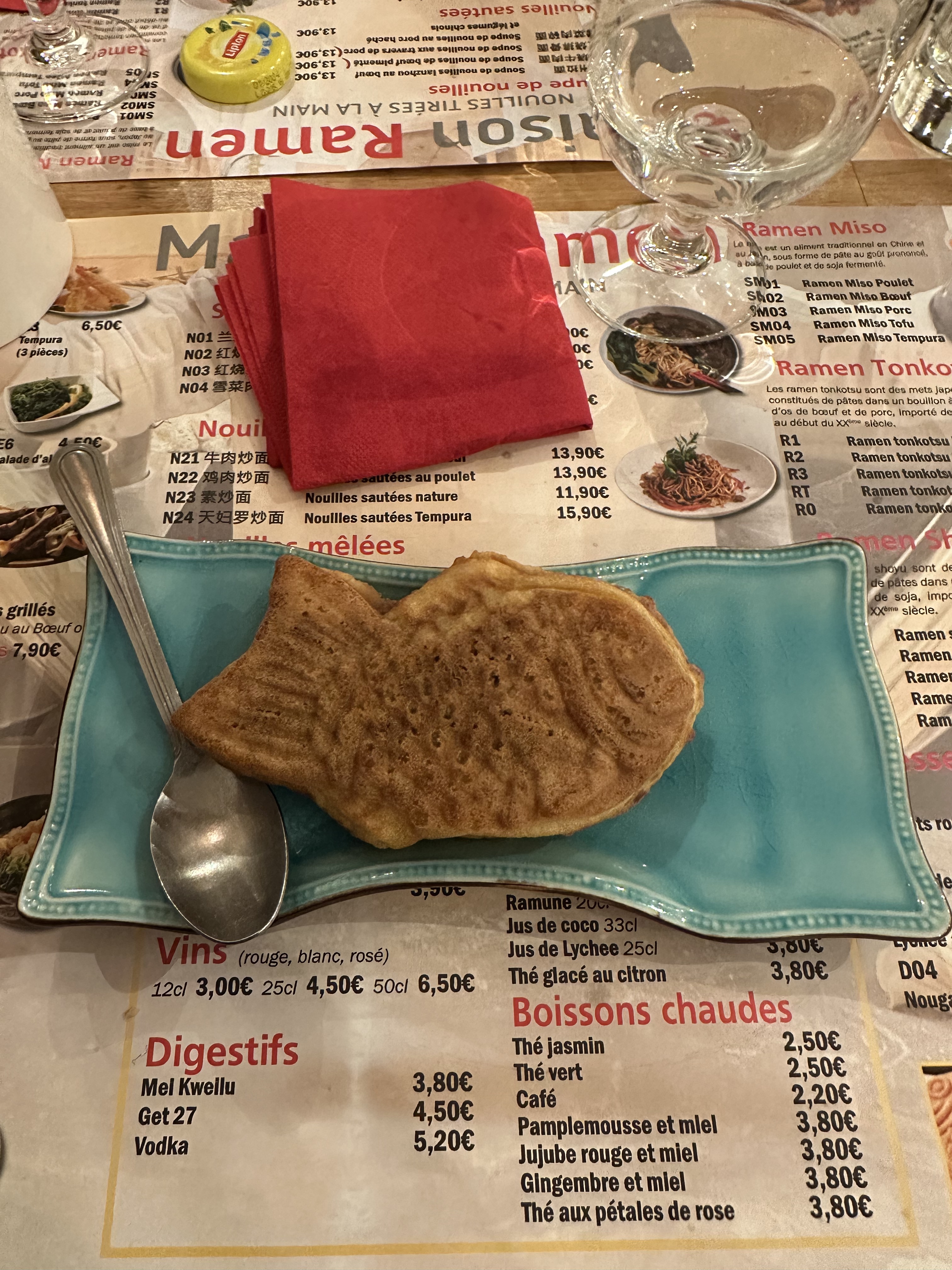 Arrivée à l'ouverture, le restaurant était déjà plein, j'ai eu la chance d'avoir la dernière place disponible ! Décoration classique, agréable musique, cuisine ouverte où on peut voir l'art de la préparation du Ramen 🤩 Bons conseils des serveurs pour m'aider dans mon choix ♡ Comme boisson j'ai pris : thé aux pétales de rose servi avec une petite carafe d'eau, j'ai compris quand je l'ai goûté : très sucré, mais très agréable en bouche 🥰 En entrée j'ai pris une galette chinoise fourrée au porc, très bon ! En plat, un ramen Tonkotsu au porc avec un oeuf: WAOU quel parfum enivrant! Une explosion de saveurs dans un seul bol 🥰 La pointe de gingembre ajoute une magie au ramen 😍 Et quand on melange le tout c'est PARFAIT 👌 En dessert j'hésitais entre deux : j'étais tentée de prendre la boisson à base d'haricots rouges mais il n'y en avait plus 😔 Je me suis donc rattrapée sur mon deuxième choix : Taiyaki. C'est une sorte de gâteau moelleux, à base de pâte de gaufre, fourré aux haricots rouges sucrés, c'est ultra délicat et trop bon. La forme est mignonne : un petit poisson 😊 Le restaurant est petit mais l'ambiance est agréable, même entre voisins de table 😉 Rapport qualité-prix idéal, je recommande les yeux fermés ✌️😁 Je reviendrai, accompagnée cette fois-ci, afin de pouvoir faire découvrir le meilleur ramen de Lille 🥰🍜