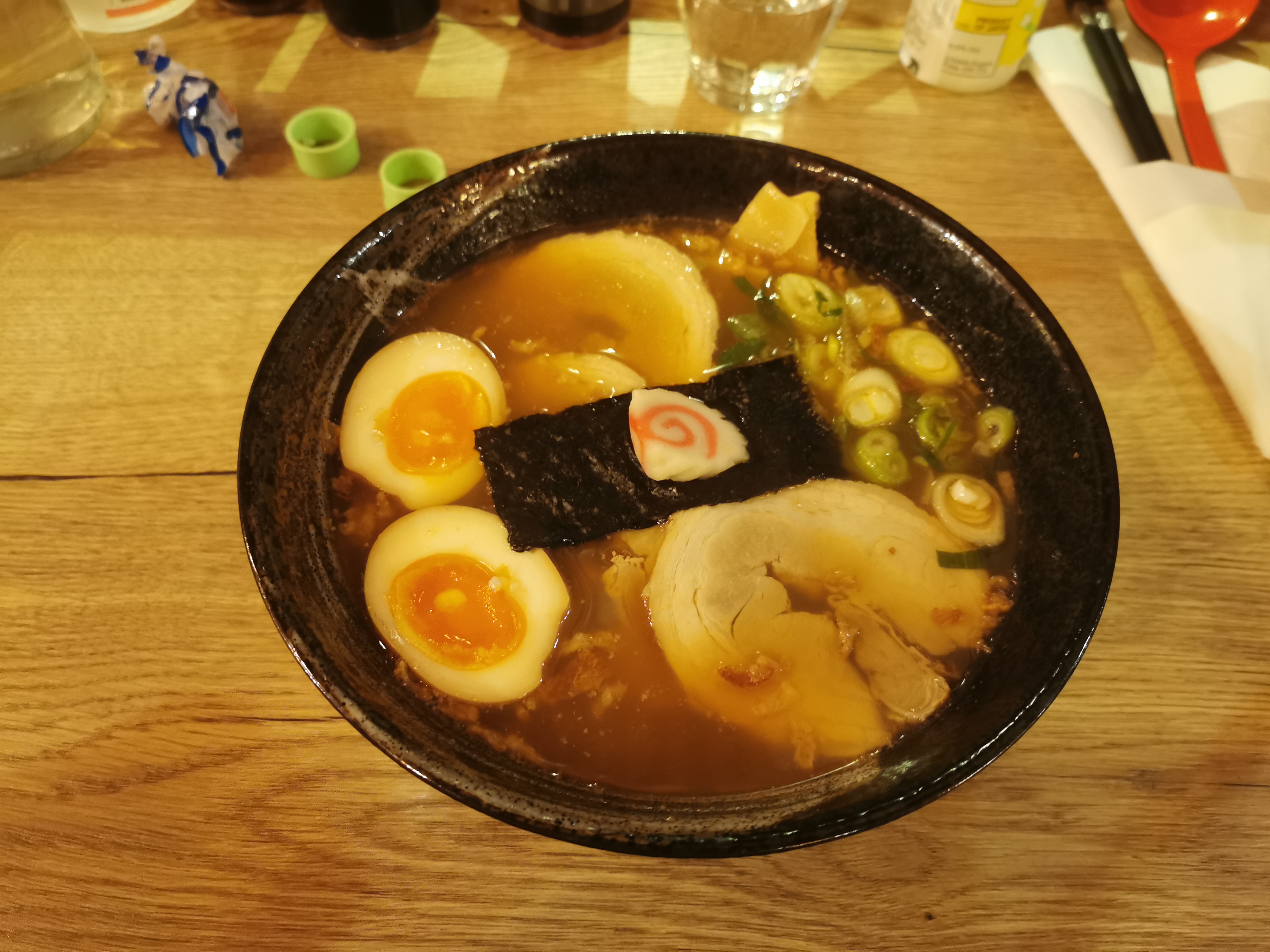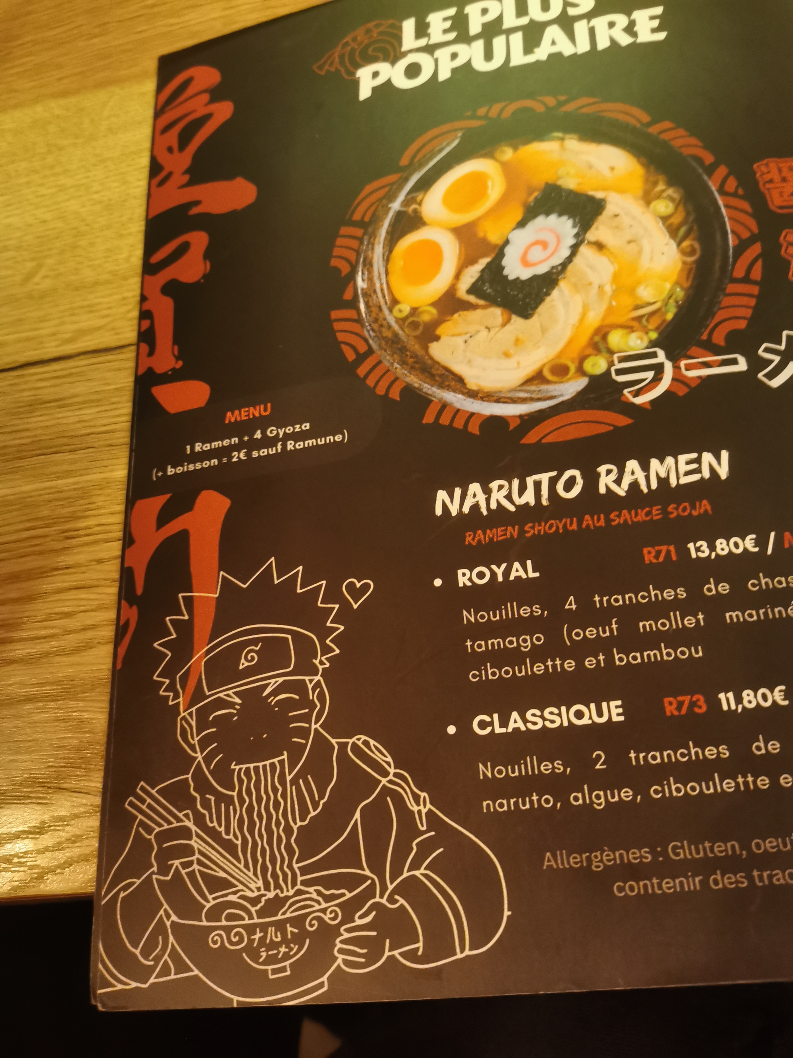 Comme dans l'anime, même si je crois que cela n'a rien à voir avec le resto, les enfants étaient ravis. Le serveur a même offert le supplément naruto parce qu'elle avait son deguisement uchiwa. Donc vraiment sympa. J'ai pris celui au boeuf piquant qui arrache vraiment, un délice. Je recommande de prendre le piment a part pour doser. Entre 13€ et 15€ le ramen 🍜, très copieux, je suis repartie avec la moitié dans un doggy bag. La limonade japonaise à 4€, faut vraiment etre otaku... 😅
