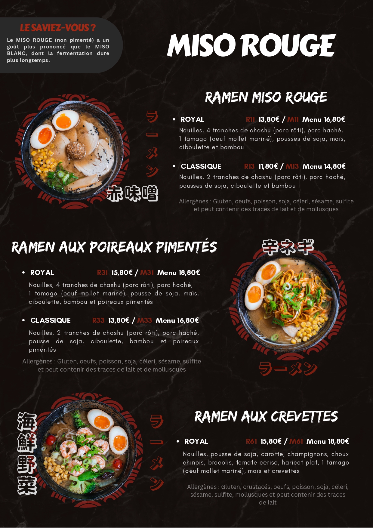 Carte avec un grand choix de ramen. Ils proposent également des donburi et du curry. Grande possibilité de suppléments. Prix abordables, service rapide et agréable. Très bon ramens un peu fermes au début ce qui permet de ne pas finir avec une bouillie de nouilles ! Oeufs mollets bien cuits et belle présentation :)