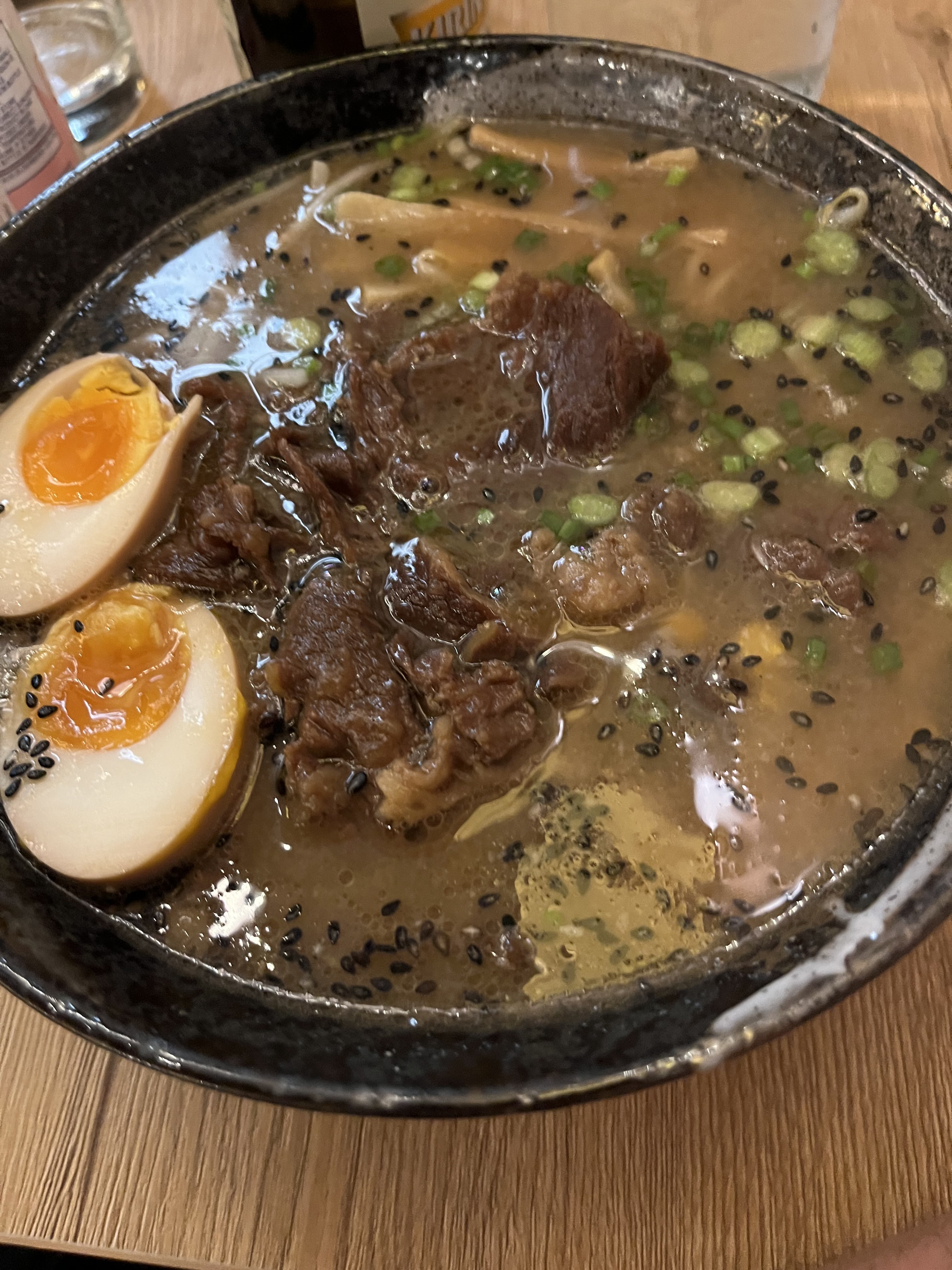 J'ai pris le ramen au bœuf miso rouge (seul ramen halal) sans entrée ni dessert Je précise avoir pris le gros bol, et sincèrement c'était bien balèze lol Gustativement parlant, le ramen ne m'a pas plu personnellement, au gout cela se rapprochait d'un boeuf bourguignon donc je n'ai pas vraiment apprécié un ramen (je suis donc un peu déçu) Concernant les nouilles en elles-mêmes, elles étaient cuites comme il faut, idem pour la viande et les oeufs (donc cuissons bien maitrisées) Donc peut-être qu'au gout les autres plats proposés sont susceptibles de plaire davantage que l'option halal au boeuf si jamais vous n'avez pas cette restriction alimentaire Le service était rapide, les serveurs souriants, professionnels et l'ambiance du restaurant était sympathique !