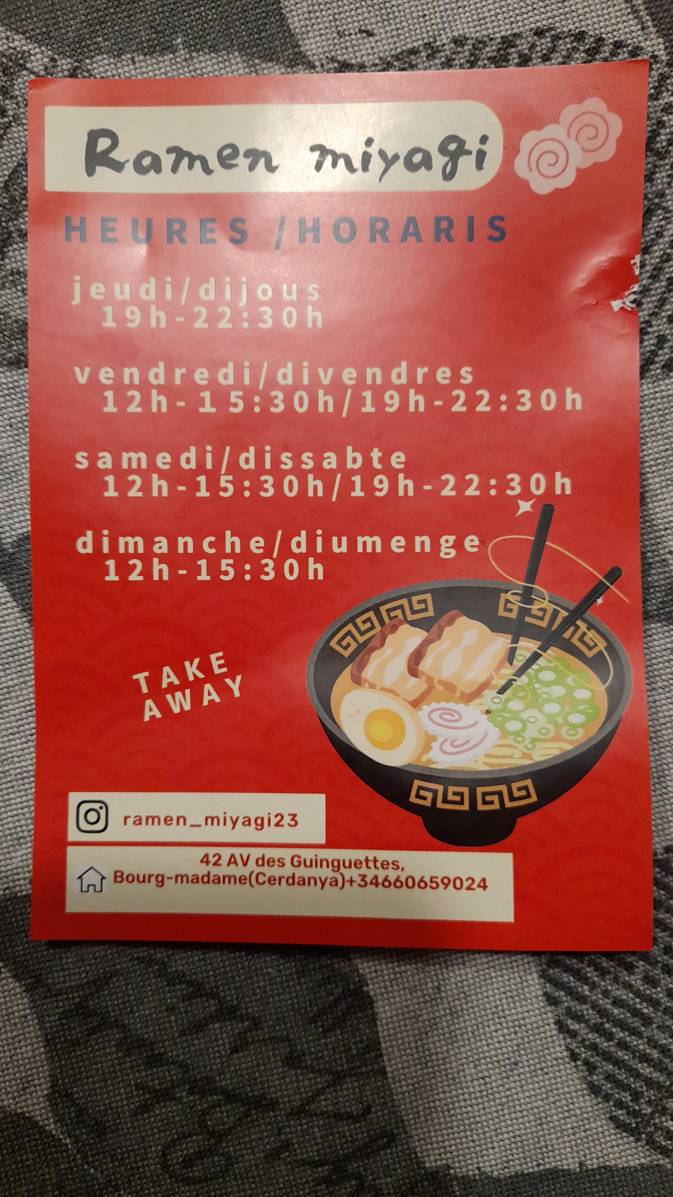 Voici toutes les informations sur le Restaurant de nouilles (ramen) Ramen Miyagi qui ce trouve au 42 Av. des Guinguettes, 66760 Bourg-Madame (66). Sur cette fiche vous trouverez les photos, l'adresse, les horaires d'ouverture, le numero de téléphone et les avis clients.Vous pouvez églement rédiger un avis si vous le souhaitez en bas de page.