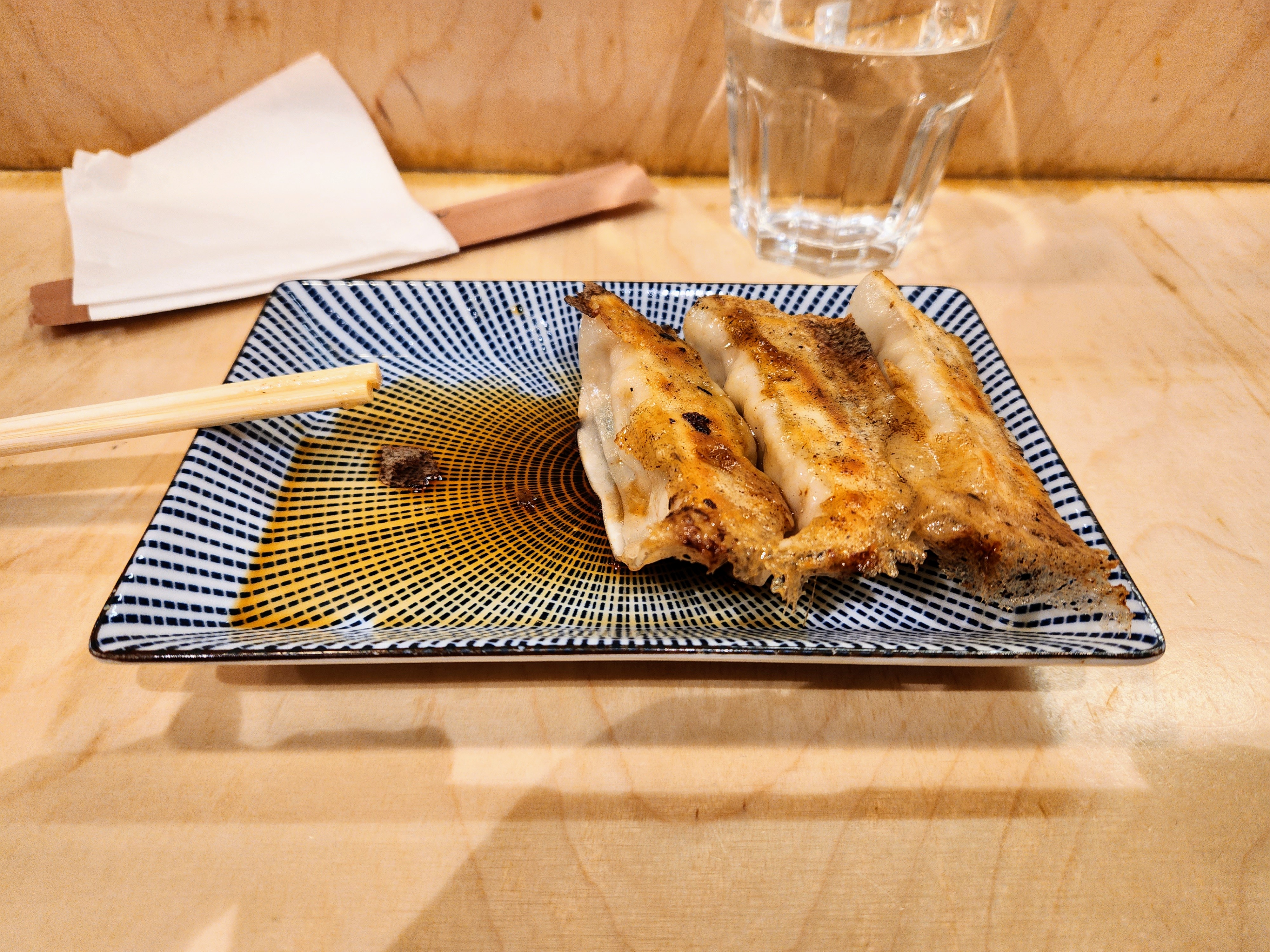 Le bouillon était très bon, la viande bien cuite mais les oeufs n’ont pas mariné assez longtemps. Les nouilles étaient correctes. Pas de chance pour nous il n’y avait pas de gyoza ce jour là.