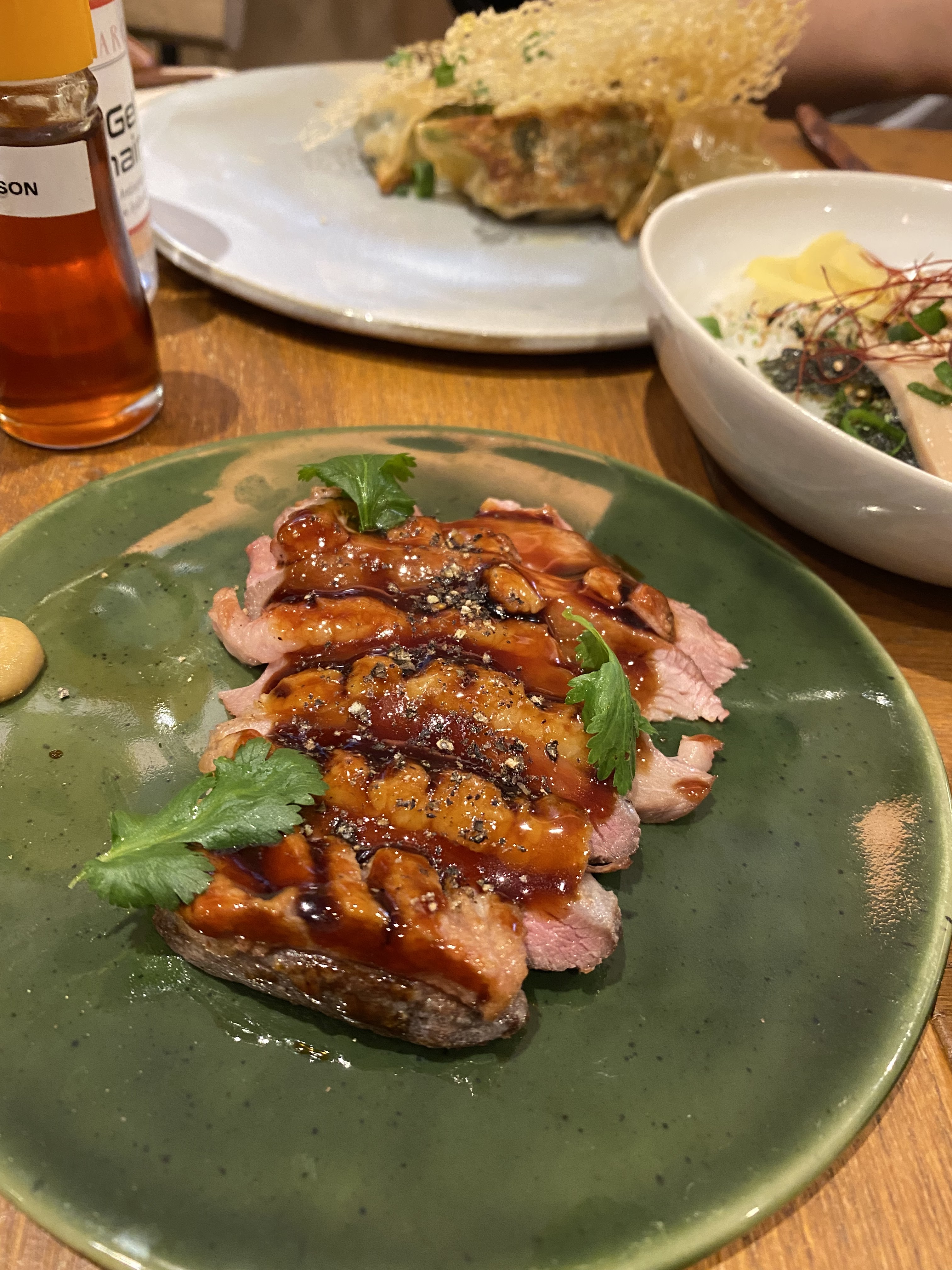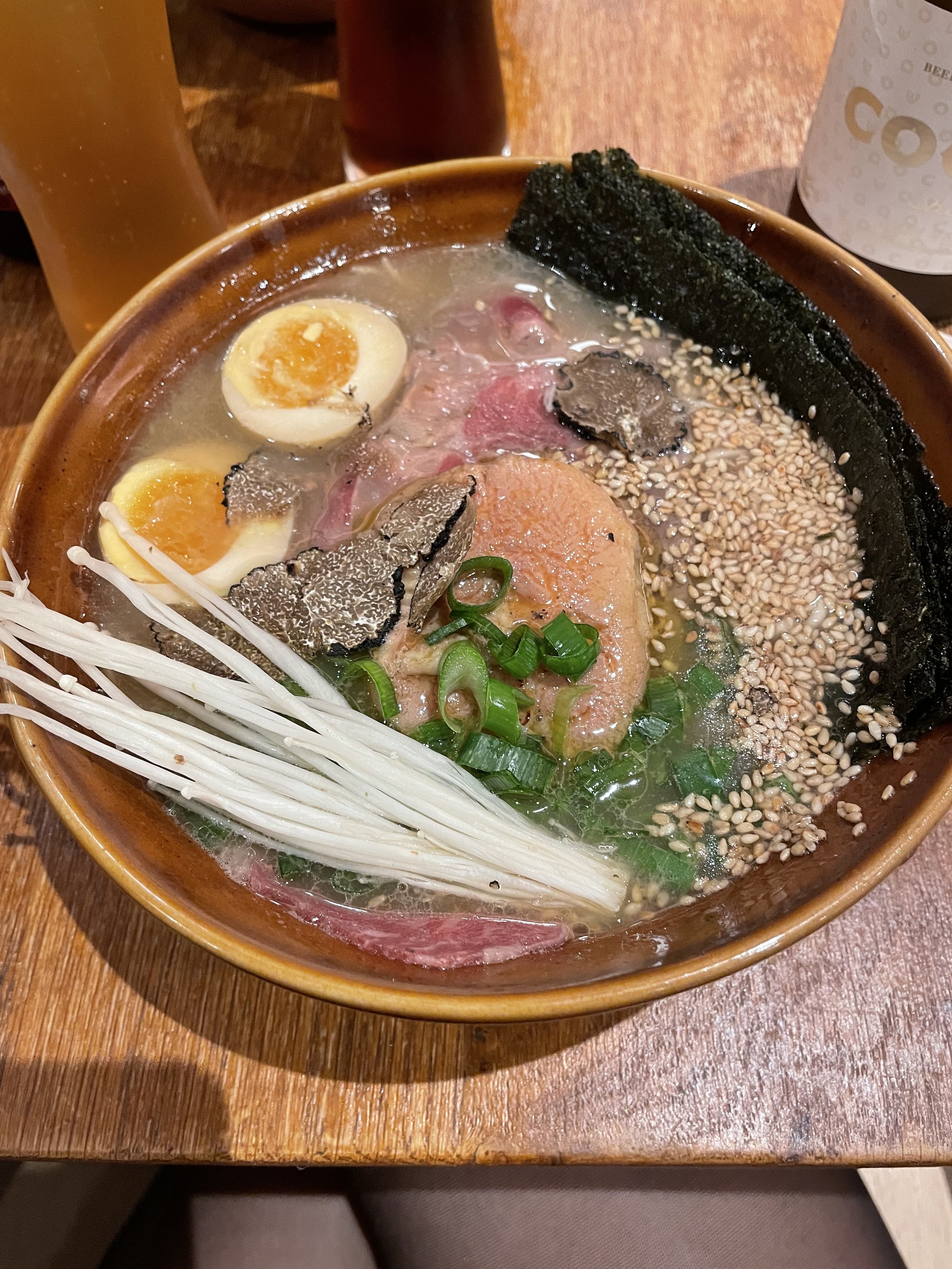 Venu en groupe pour expérimenté le fameux ramen signature, nous n'avons pas été déçu ! Certes, 34€ c'est une sacrée somme pour un bol de ramen, mais c'est une expérience originale et savoureuse. A voir pour une prochaine fois pour les bols plus classiques. Ah et si vous êtes curieux, l'entrée magret de canard est un mélange qui semble étrange, mais le mariage avec le pesto et la réduction de balsamique en font une bonne surprise pour entamer votre repas.