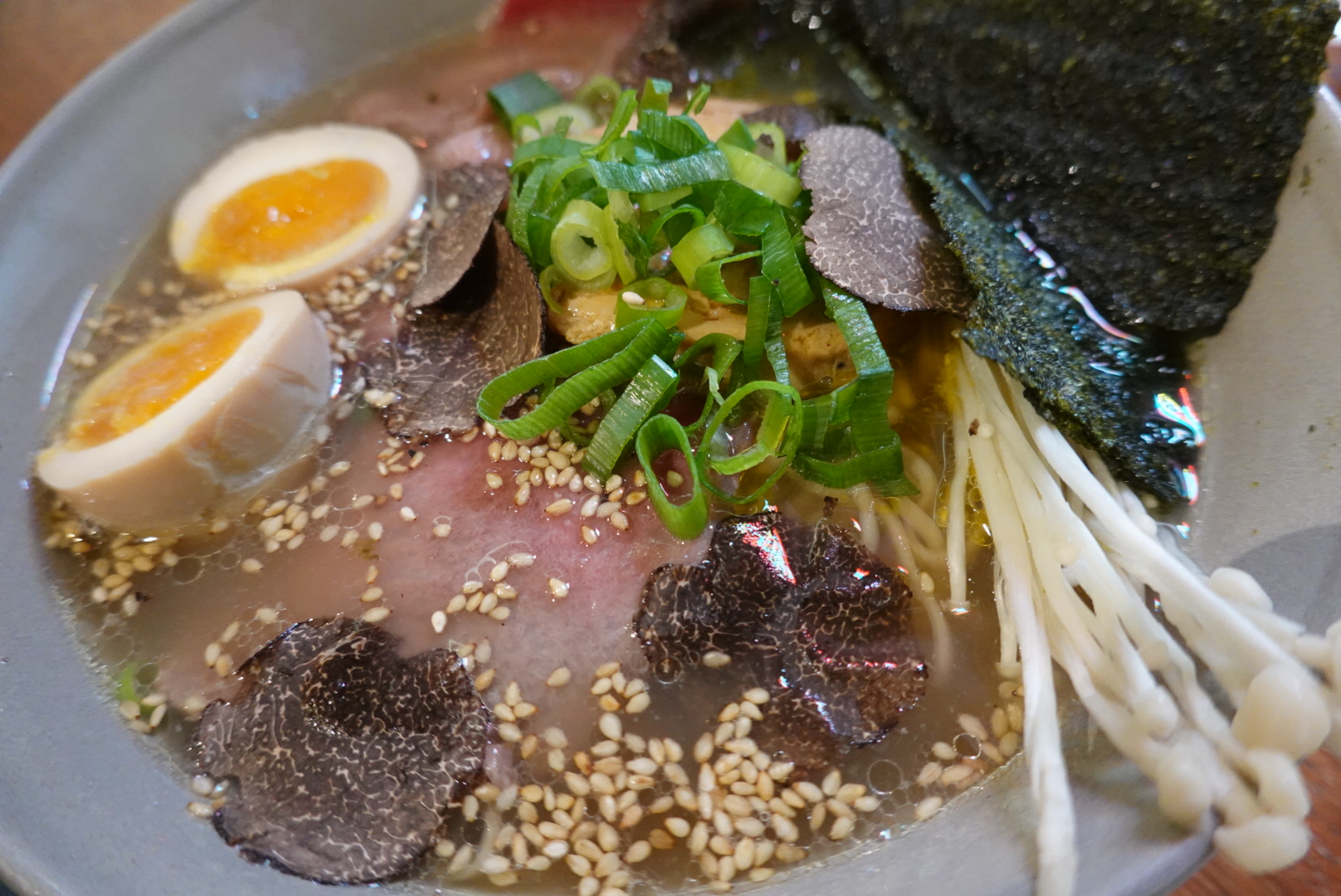 Restaurant d'exception: le service était rapide, les serveurs très agréables et souriants. Le fait qu'il y ait un ramen aussi spécial est un très bon point, je n'ai retrouvé de pareille saveur nulle part ailleurs, bien qu'il soit un peu écœurant au fur et à mesure de la dégustation (après, il suffit d'adorer le fois gras et la truffe !) Le traditionnel est exceptionnel: on sent tout de suite que le porc est mariné, le bouillon est très riche en saveurs et l'huile d'ail était merveilleusement bien dosée. Le mochi au matcha était LA découverte pour moi et je pense sincèrement que c'est le meilleur que j'aie goûté de toute ma vie. De plus chaque plat est présente soigneusement, en plus du bon goût, c'est visuellement plaisant. Le seul hic est peut-être la musique d'ambiance qu'il y a, un peu trop forte et qui à mon avis, ne colle pas trop avec l'ambiance du restaurant et des saveurs. C'est en tout cas un lieu que je recommande fortement, qui fait voyager grâce à ses plats savoureux et copieux.